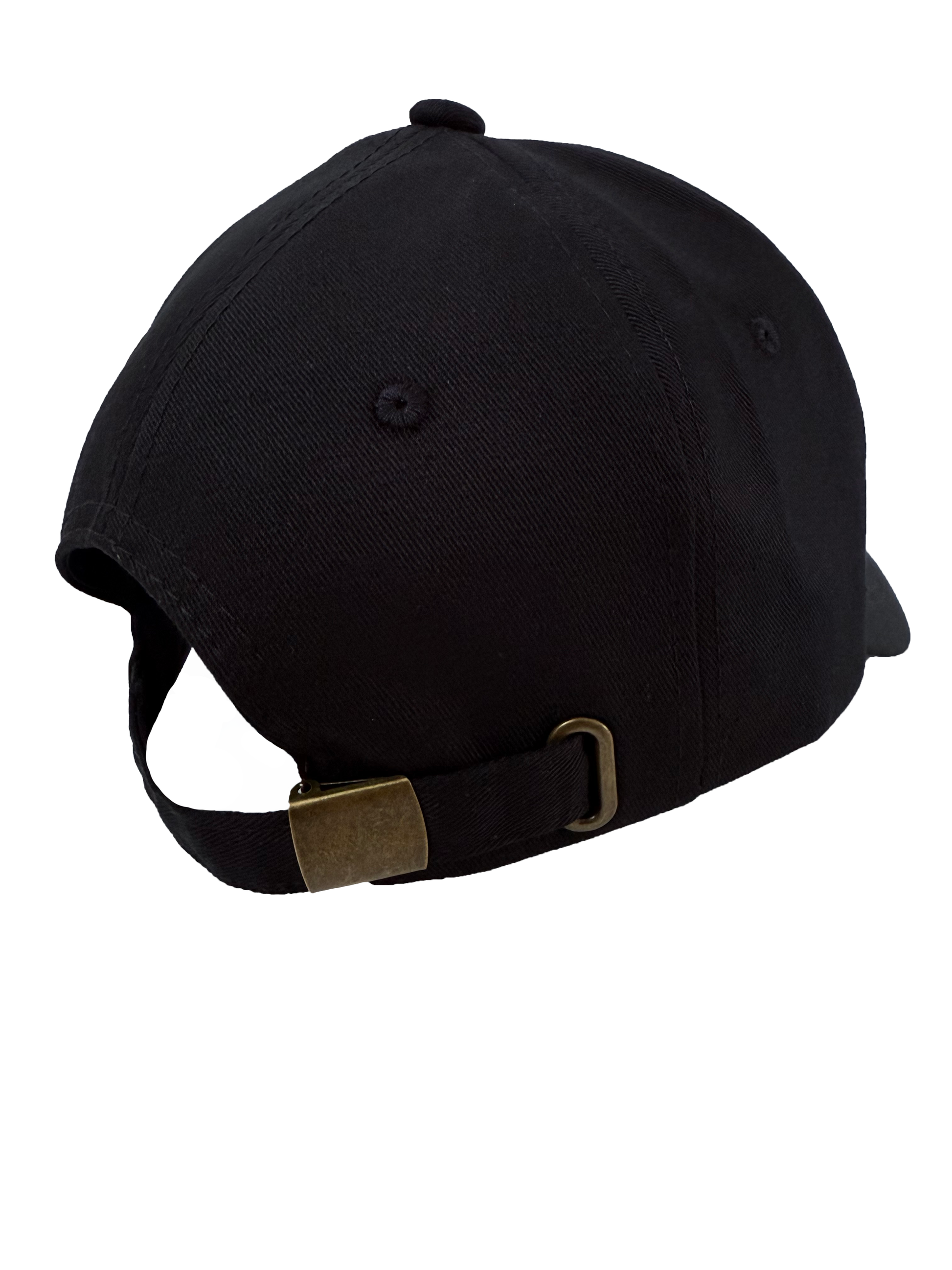 Black baseball cap with gold embroidered emblem on the front and a 3D gold embroidered font on the side with a brass buckle fastener.