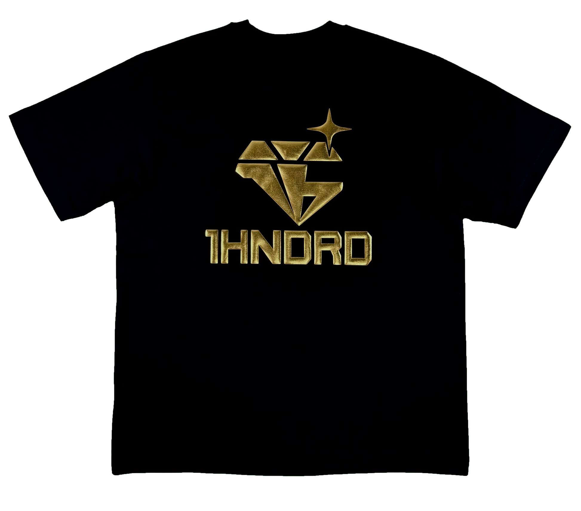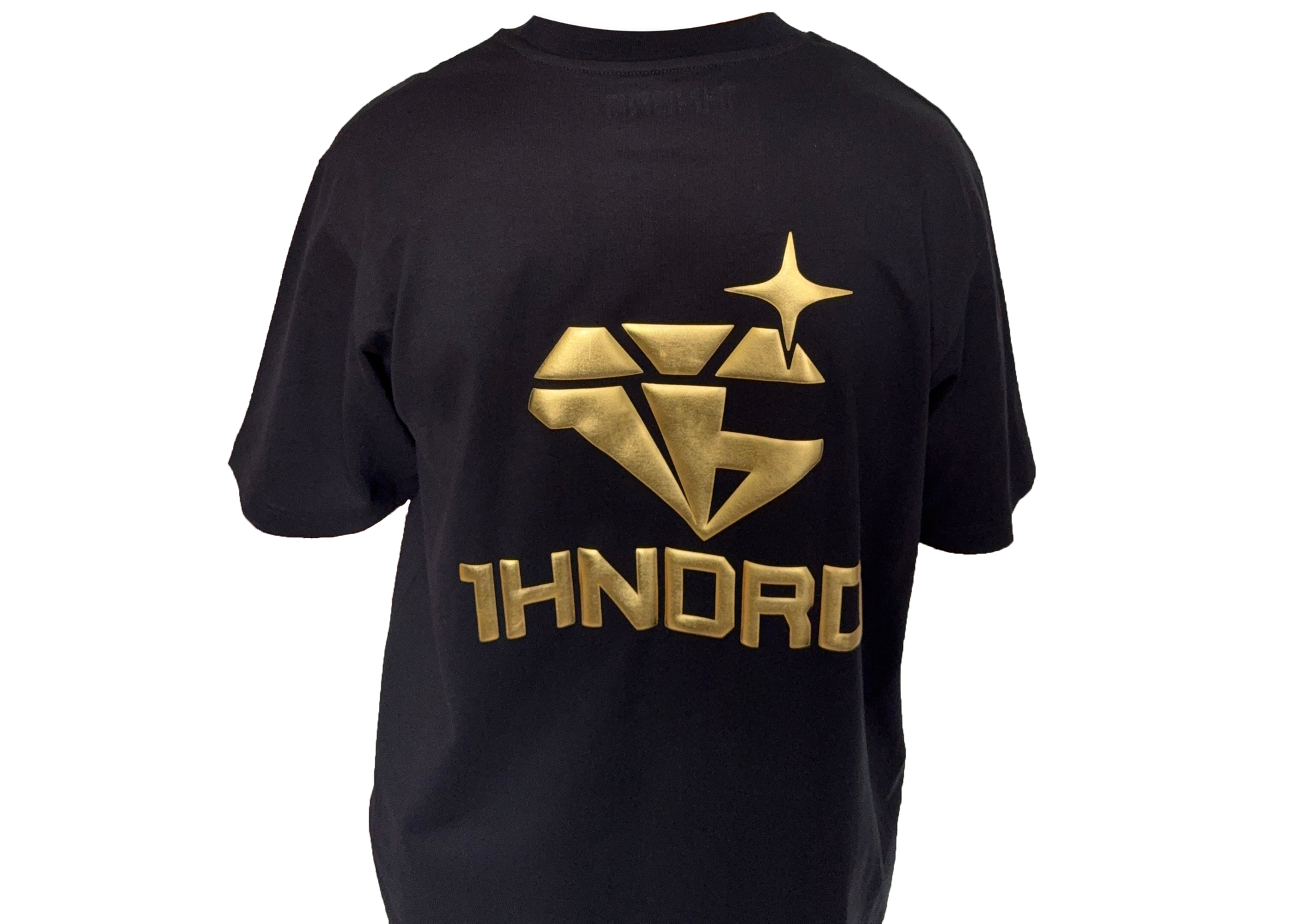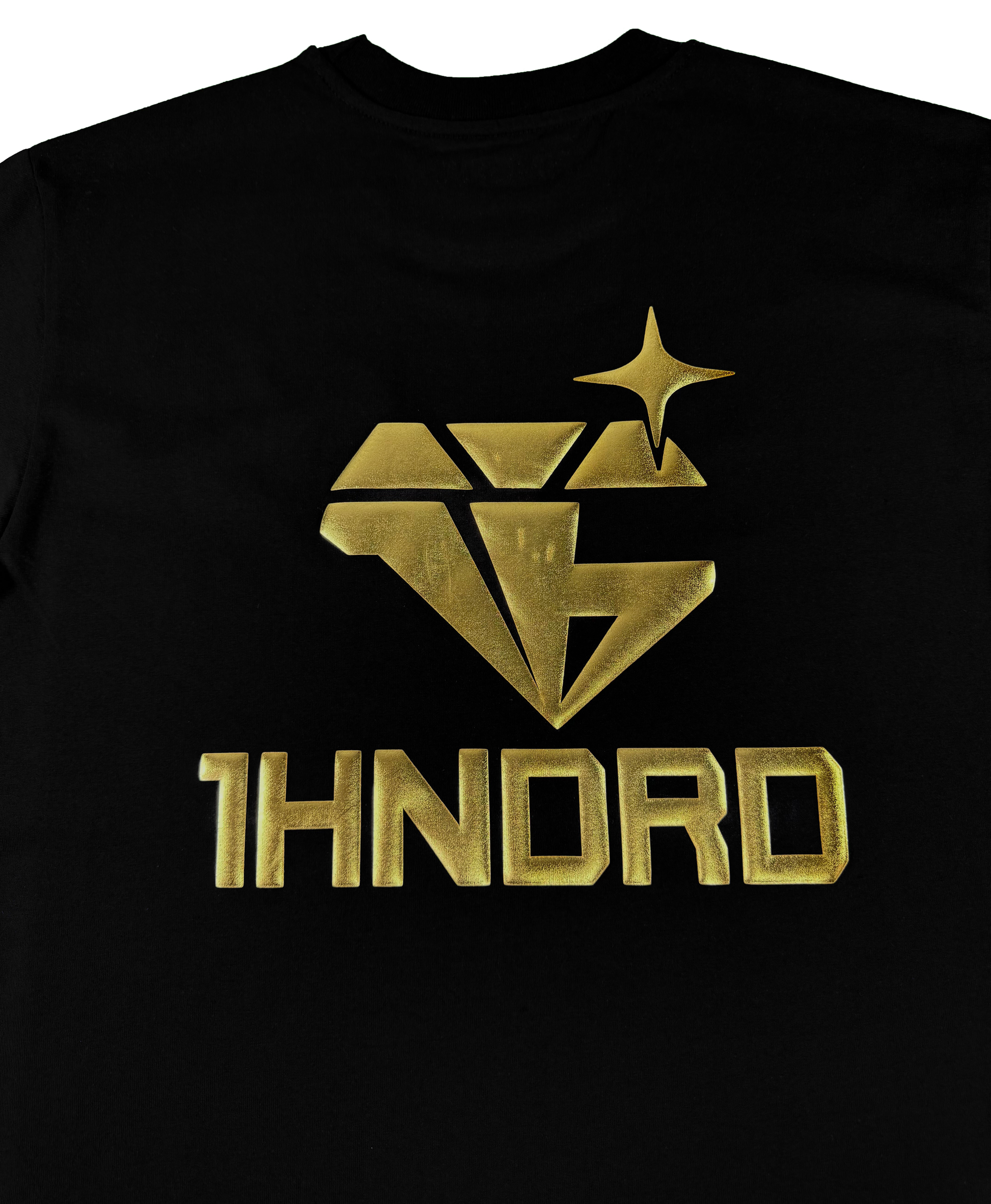 Relaxed Black T-Shirt featuring gold diamond 1HNDRD logo on front and full logo on back.