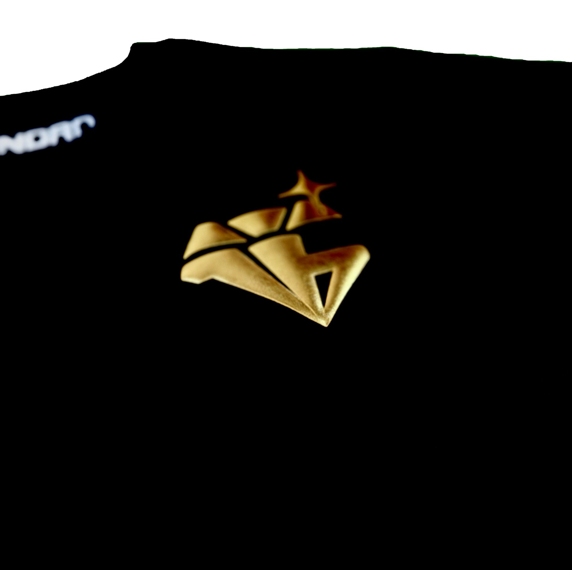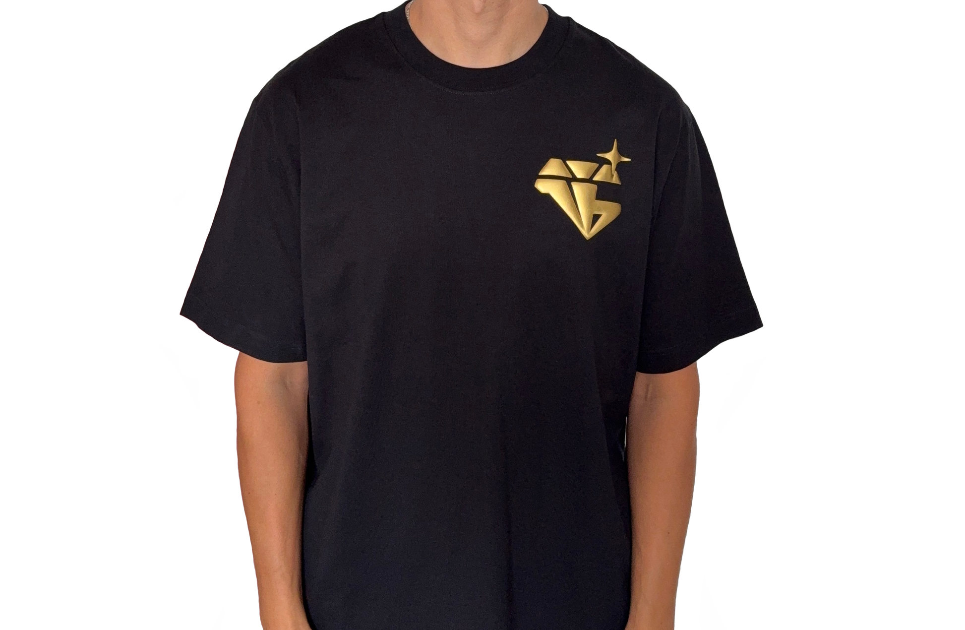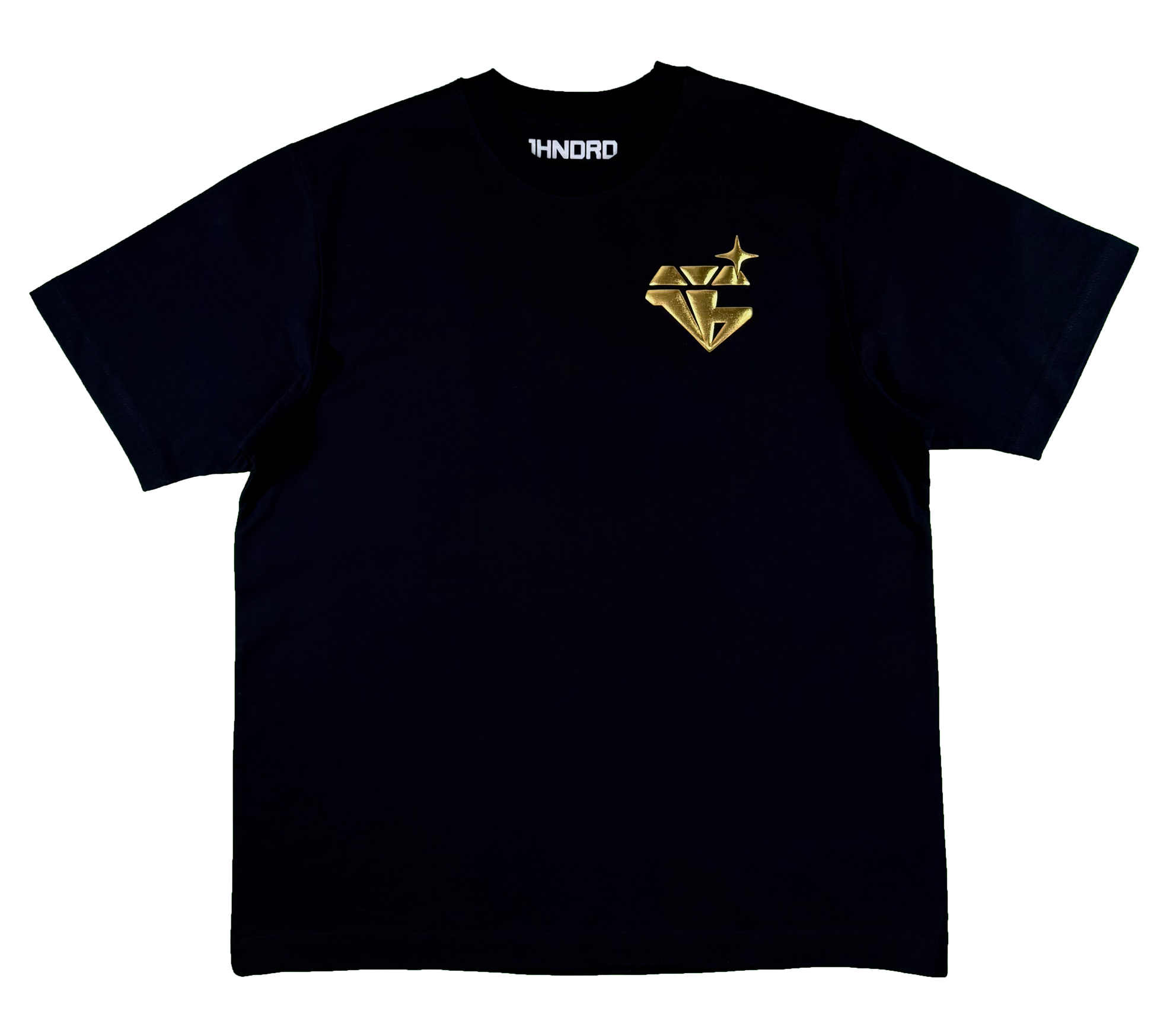 Relaxed Black T-Shirt featuring gold diamond 1HNDRD logo on front and full logo on back.