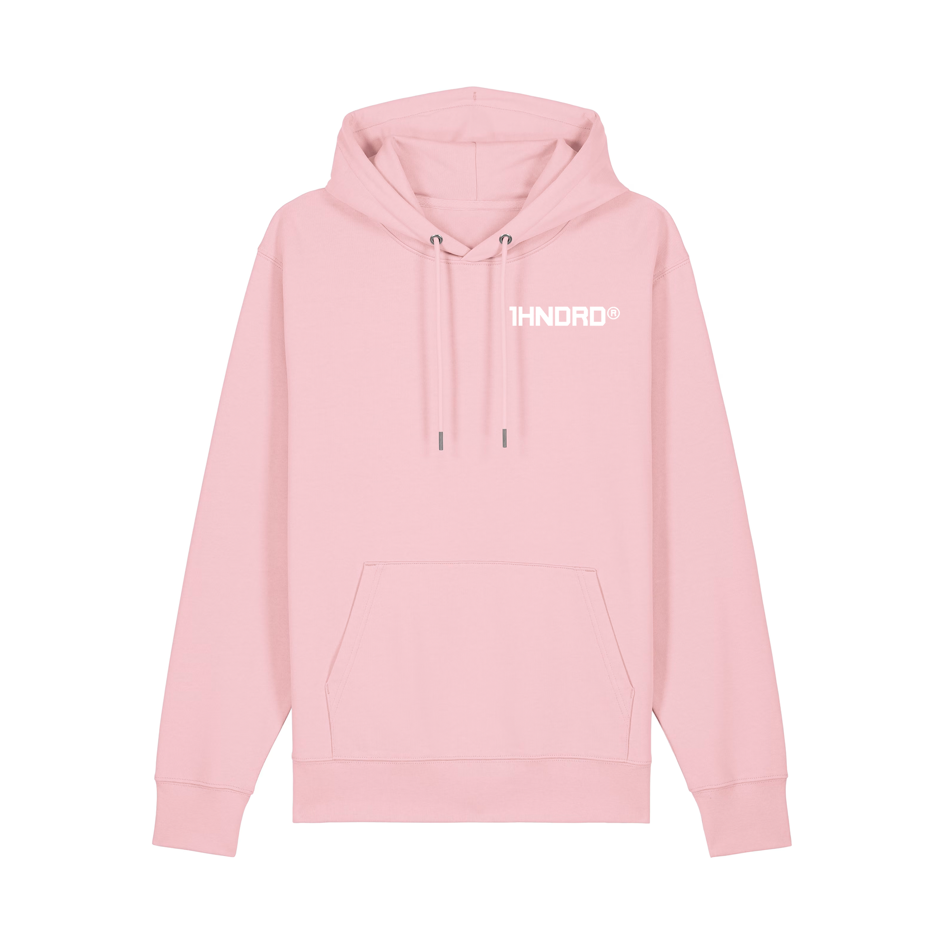 Candy Pink Hoodie with 1HNDRD® chest logo and 1HNDRD® TM logo on back.