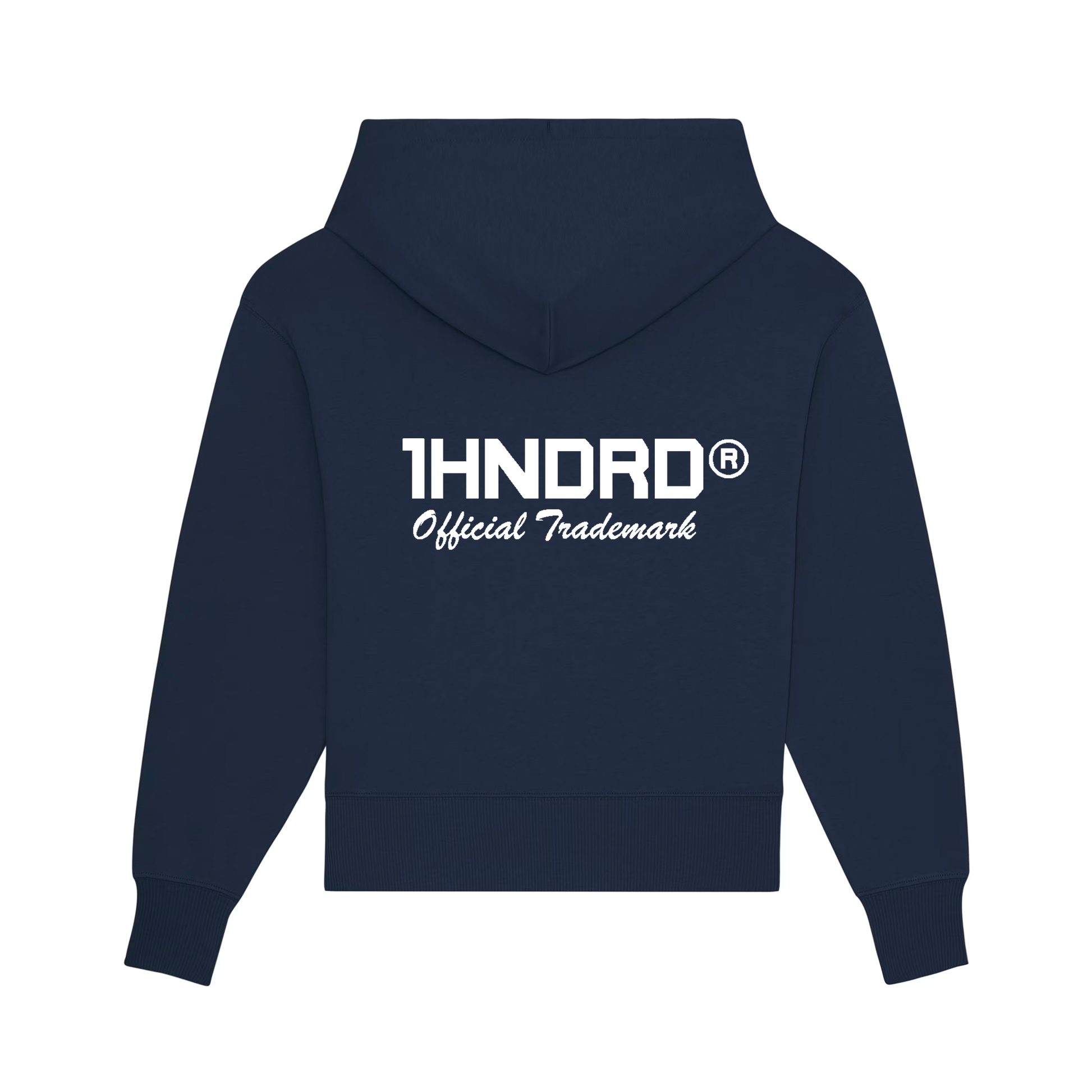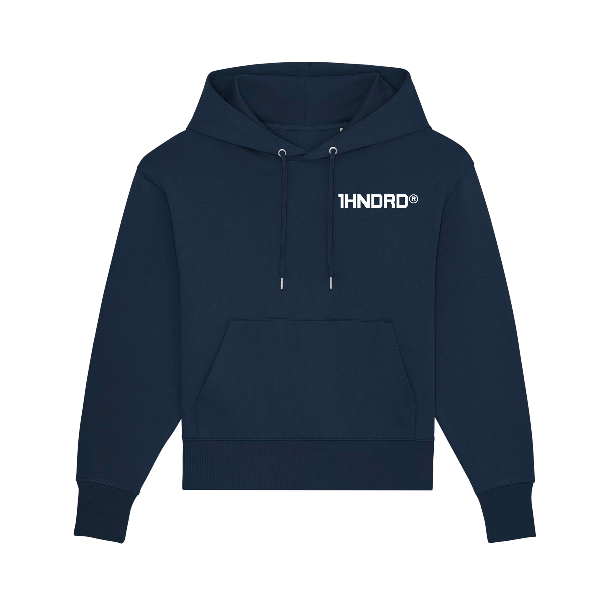 Navy hoodie with small 1HNDRD® chest logo and large 1HNDRD® TM back logo.