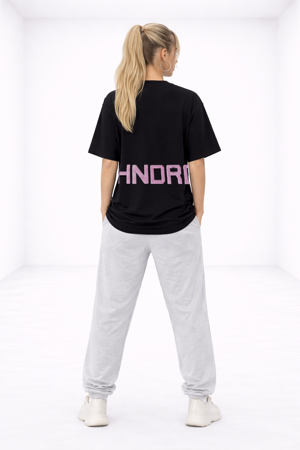 Relaxed black T-Shirt featuring pink diamond emblem on front and large font on back.
