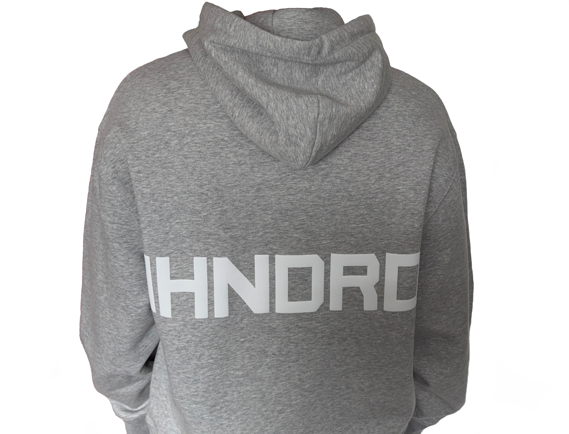 Heather grey hoodie with white 1HNDRD logo on right sleeve and back.