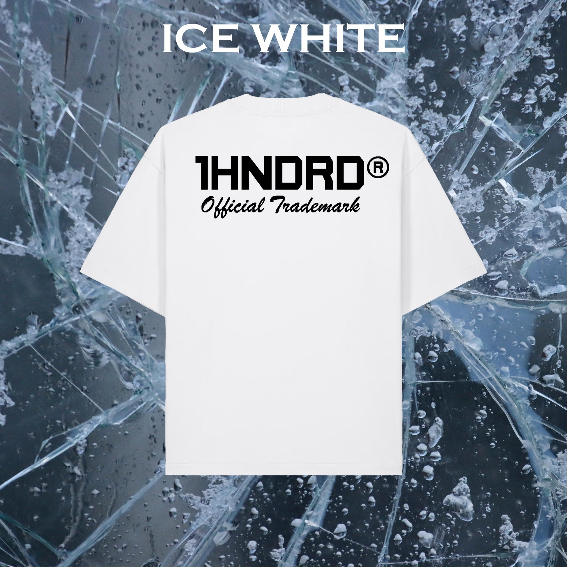 Ice White heavyweight unisex t-shirt in a boxy fit with dropped shoulders. Small black 1HNDRD® logo on chest and large black 1HNDRD® logo on back. Oversized for a street look.