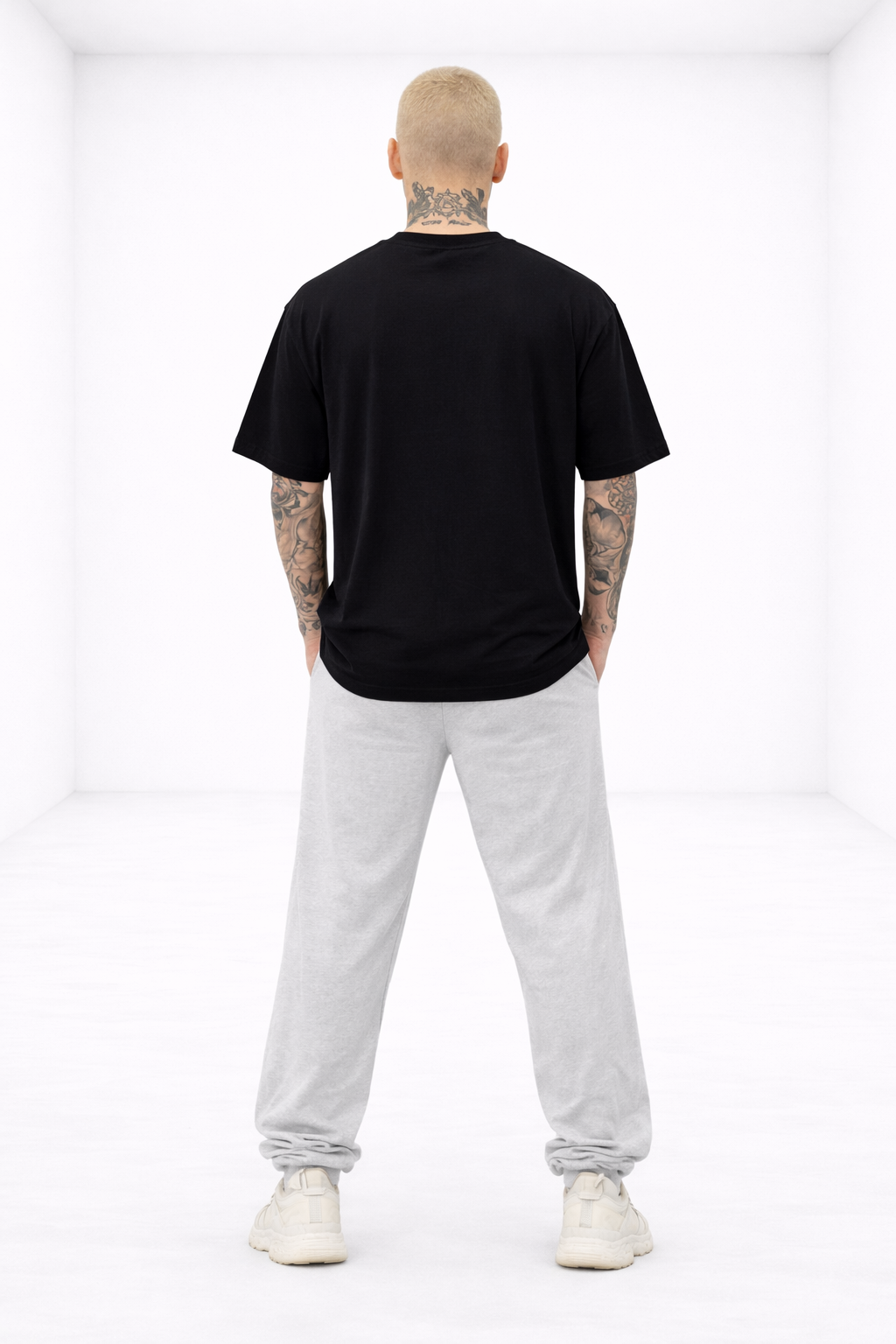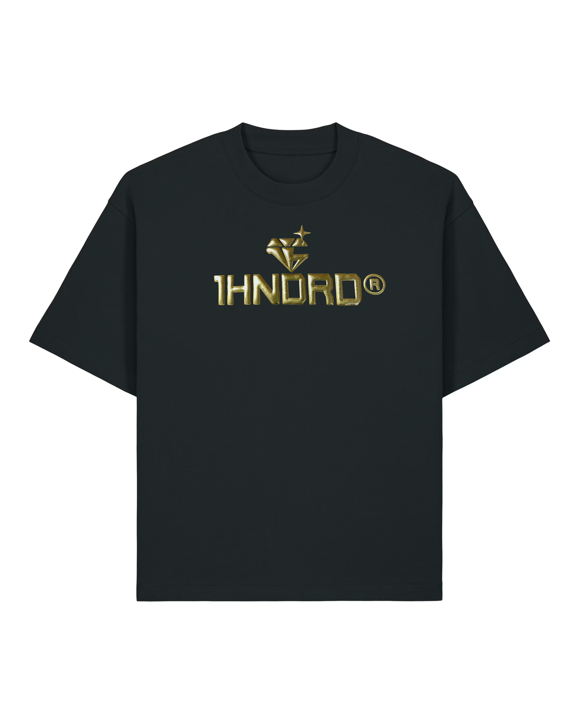 Jet Black heavyweight unisex t-shirt in a boxy fit with dropped shoulders. Raised Metallic Gold 1HNDRD® logo on chest and plain back. Oversized for a street look.