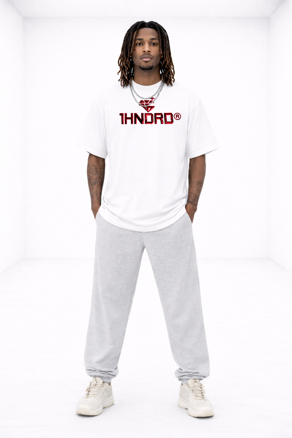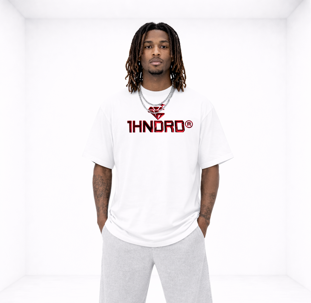 White heavyweight unisex t-shirt in a boxy fit with dropped shoulders. Raised Metallic Red 1HNDRD® logo on chest and plain back. Oversized for a street look.