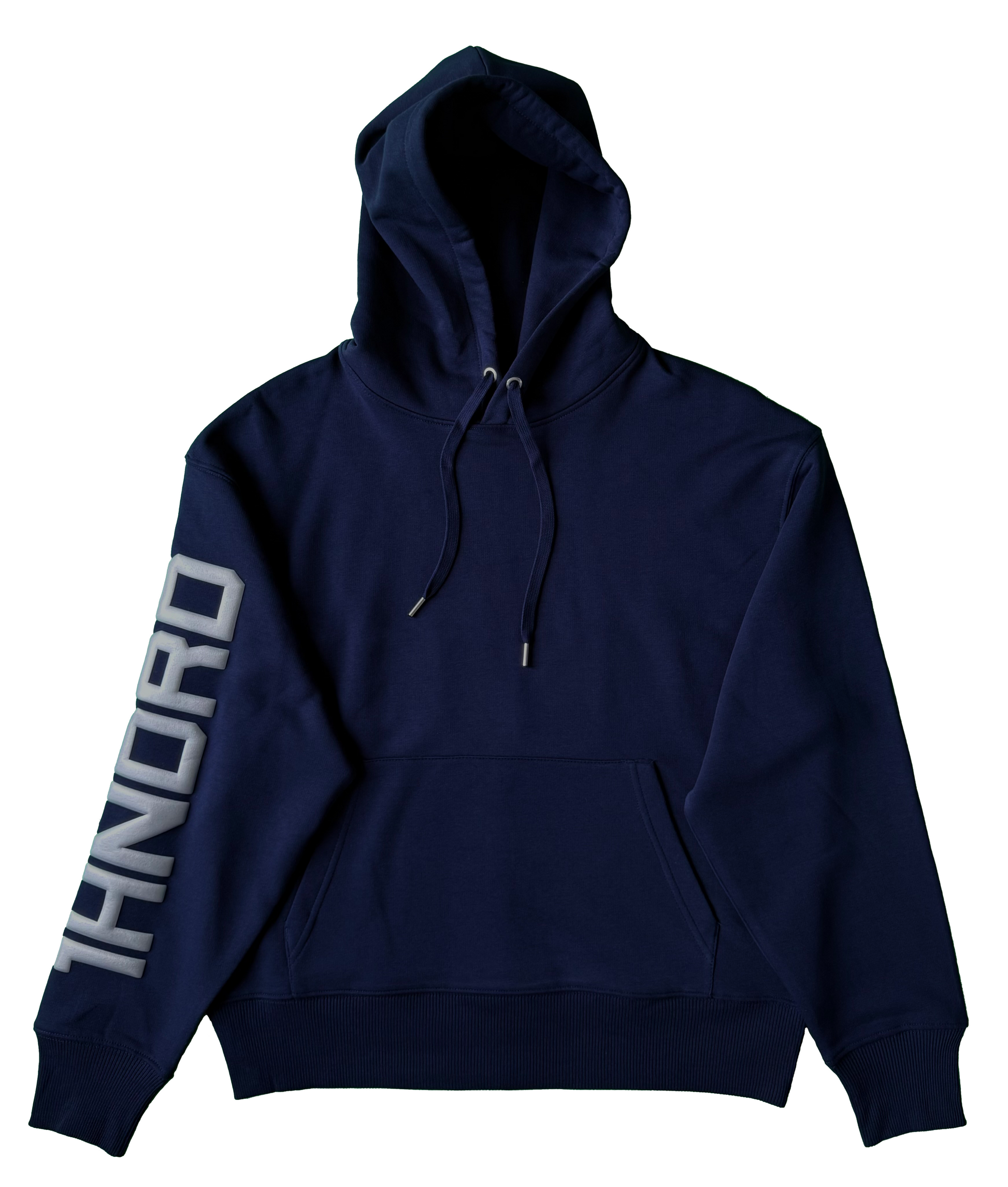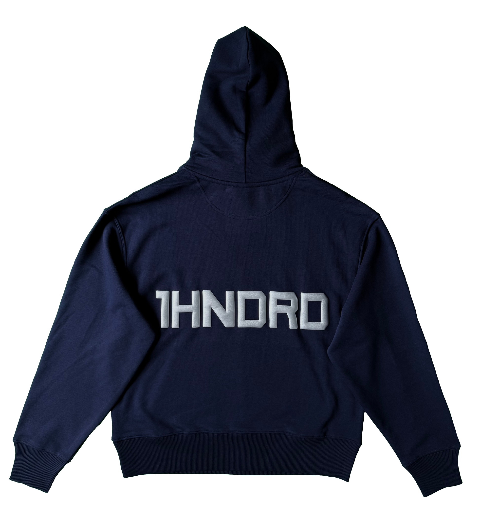 Navy hoodie with silver 1HNDRD logo on right sleeve and back.