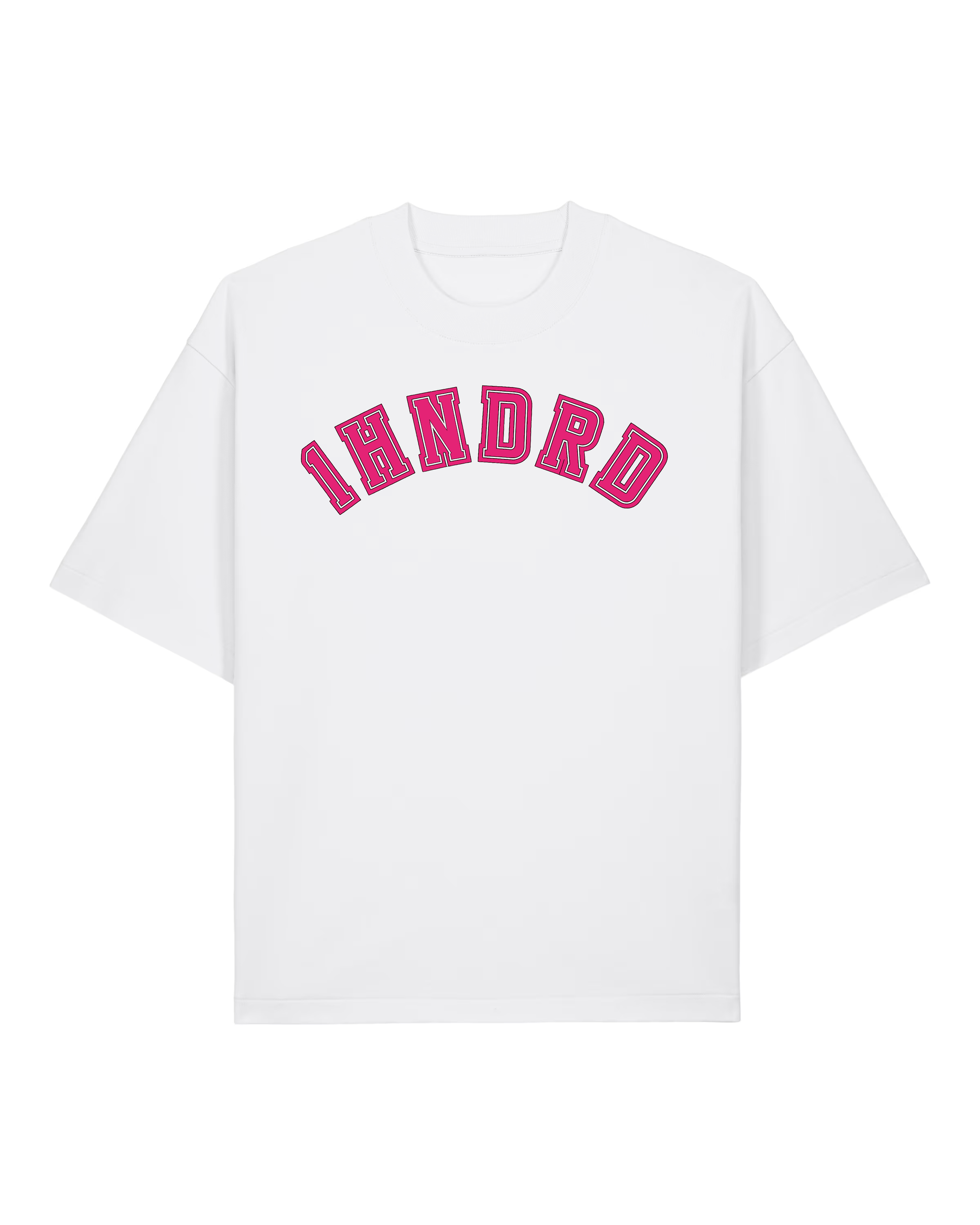 White heavyweight women's T-shirt in a boxy fit with dropped shoulders. Neon pink varsity style 1HNDRD® logo on chest and plain back. Oversized for a street look.