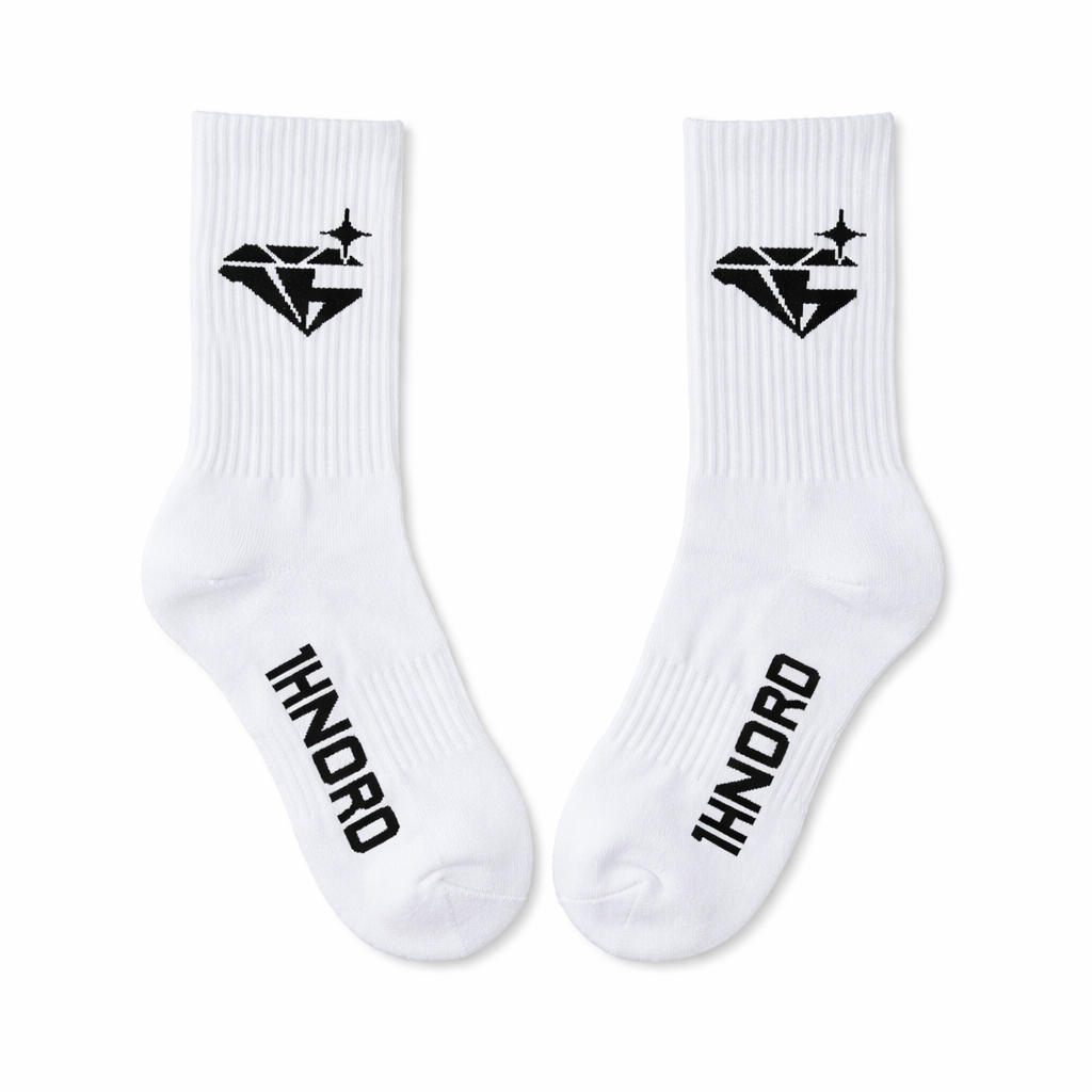 1HNDRD white emblem socks with double ankle crest and sole font logo. Size 7-11 UK.